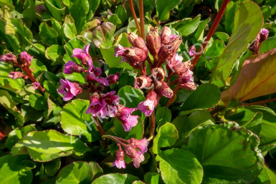 Bergenia cordifolia 'Winterglut' je velice působivým kultivarem bergénie. Velmi kompaktní tvar, nádherné květy a ještě působivější olistění jsou jen malý výčet z pozitiv, který tento kultivar má. Jedná se o vytrvalou rostlinu, která se rozšiřuje pomocí tlustého plazivého oddenku. Vytváří okrouhlé kožovité listy, které vytrvávají na rostlinách i přes zimu. Navíc se v tomto období zbarvují do krásné karmínové barvy. Vykvétá na jaře drobnými temně růžovými květy, zvonečkovitého tvaru, které jsou uspořádány v husté velké latě. K řezu se hodí nejen květy, ale i listy. Tuto bergénii lze velmi dobře použít jako robustní půdopokryvnou rostlinu.
