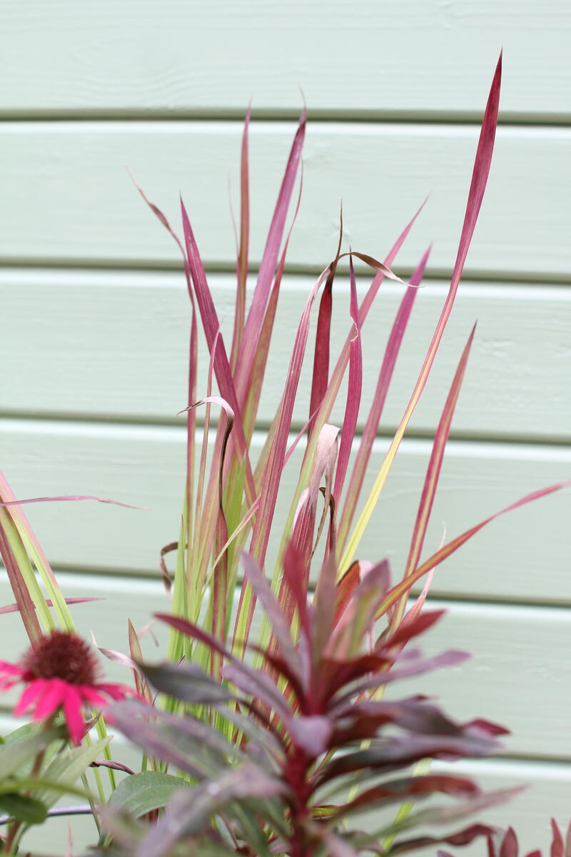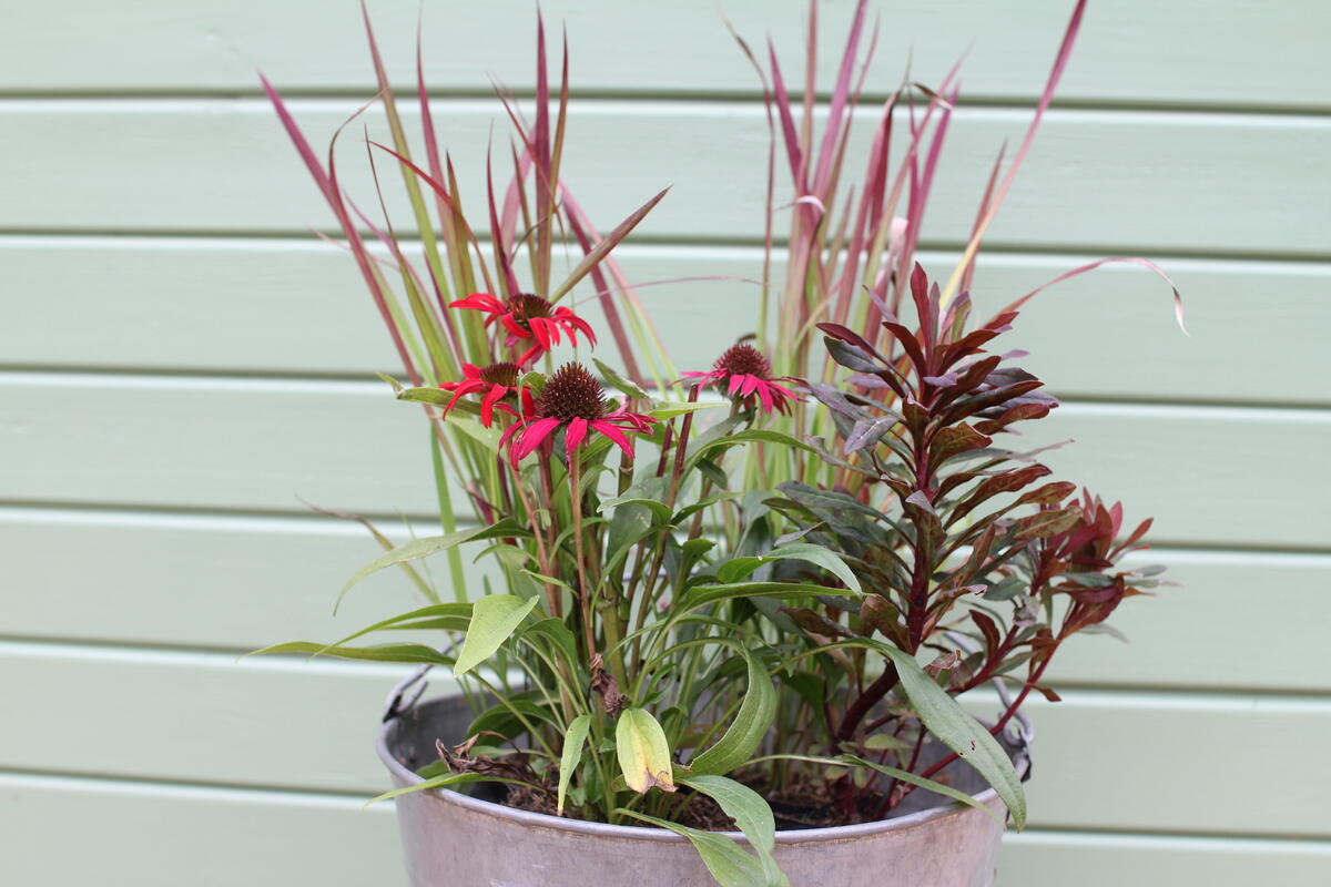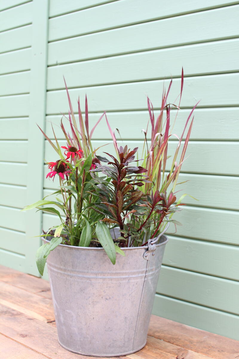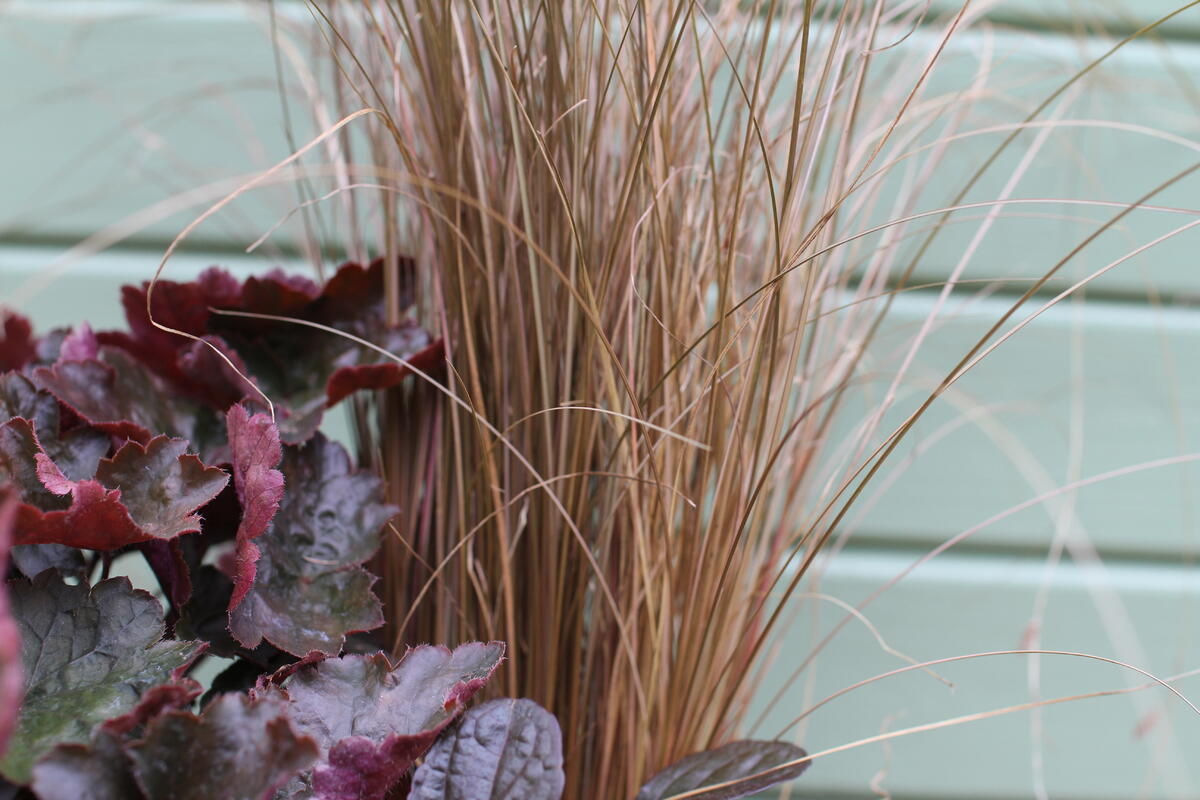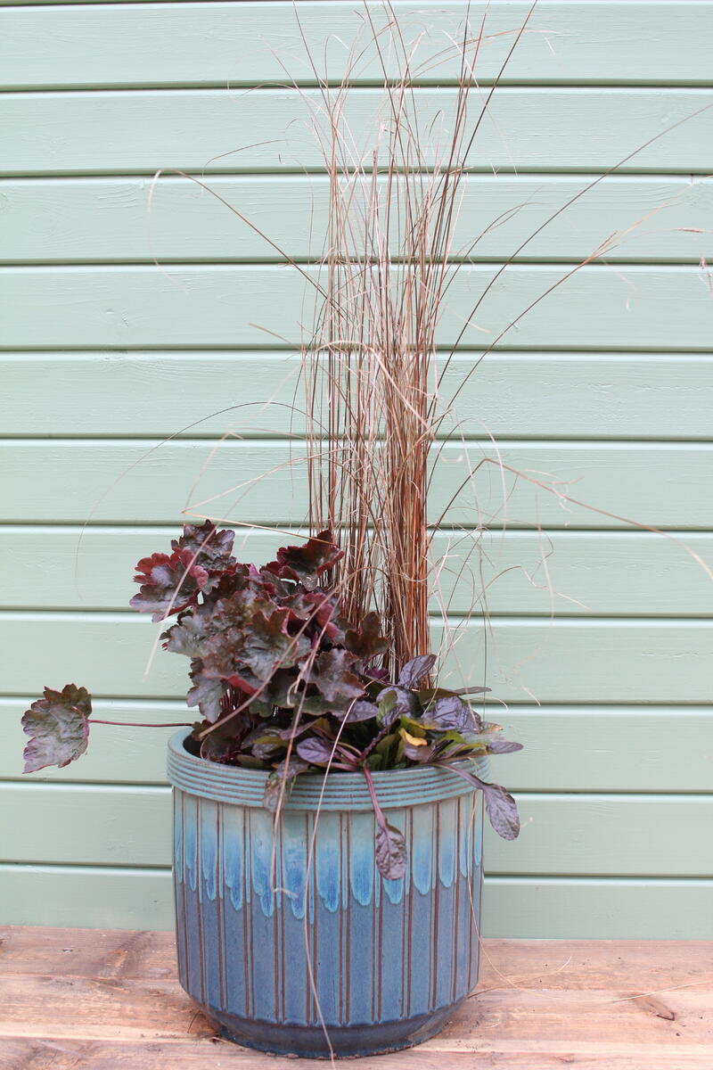 Do modré keramické nádoby jsme vysadili Dlužichu ‘Rachel’, Zběhovec ‘Midnight Mystery’ (můžete nahradit kultivarem 'Sugar Plum') a Ostřici Buchananovu (skvěle také vypadá s lehce přepadající 'Red Rooster' – na hlavní fotce).