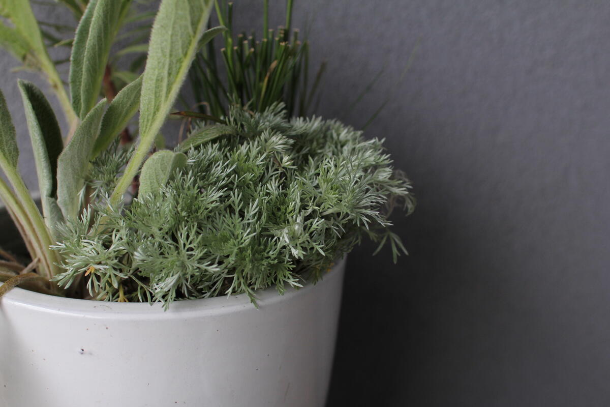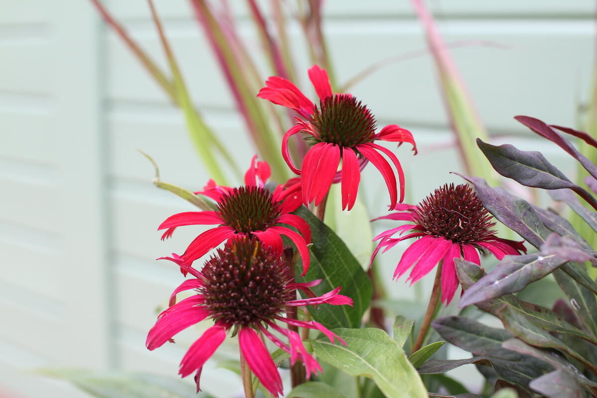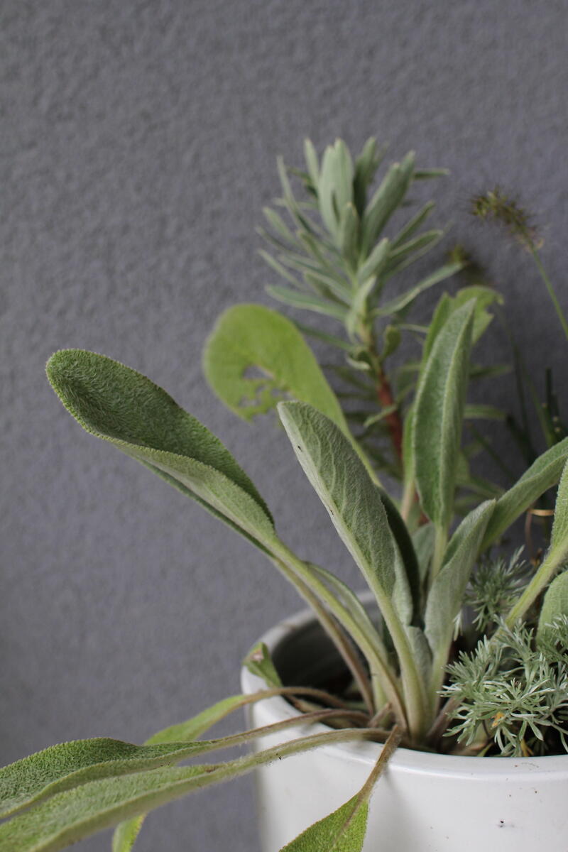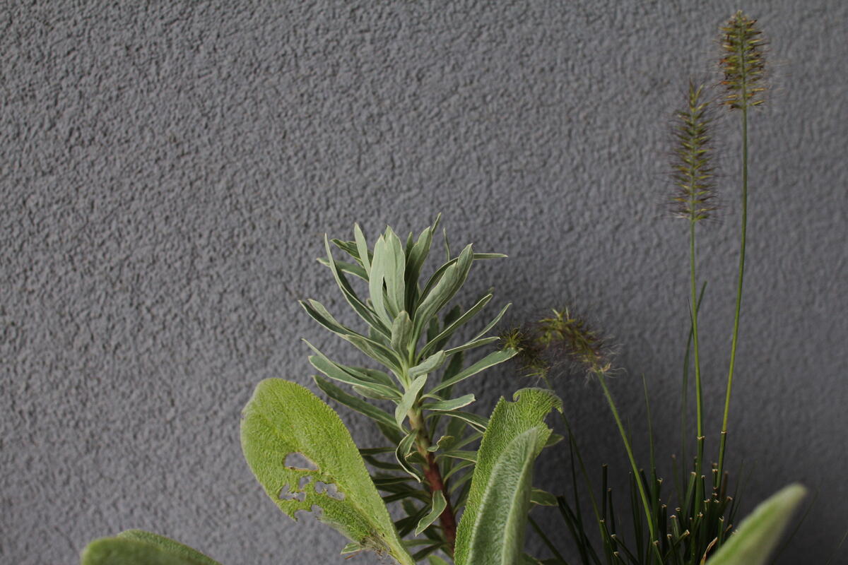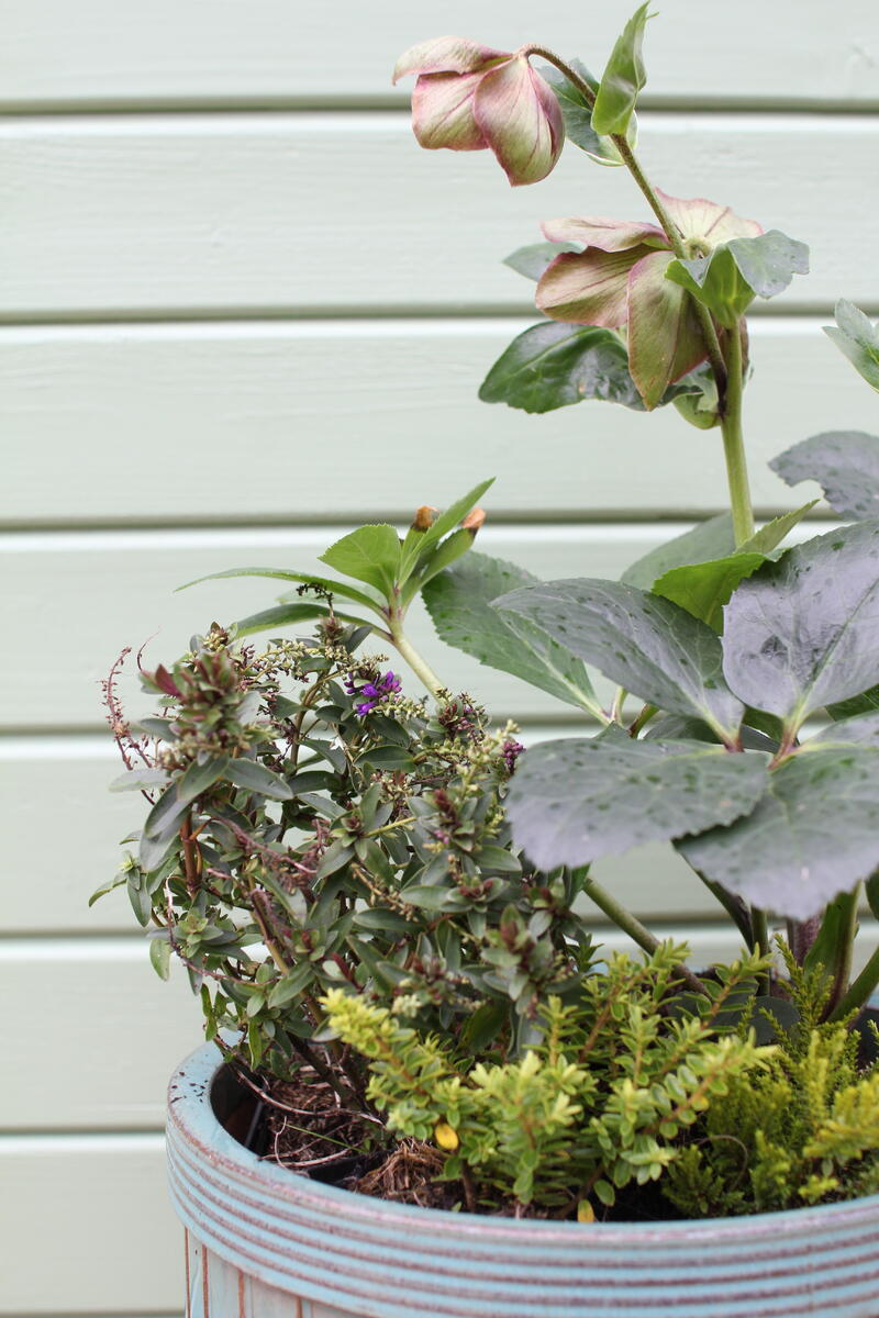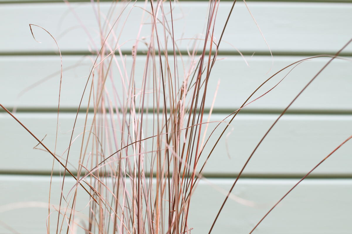 Do modré keramické nádoby jsme vysadili Dlužichu ‘Rachel’, Zběhovec ‘Midnight Mystery’ (můžete nahradit kultivarem 'Sugar Plum') a Ostřici Buchananovu (skvěle také vypadá s lehce přepadající 'Red Rooster' – na hlavní fotce).