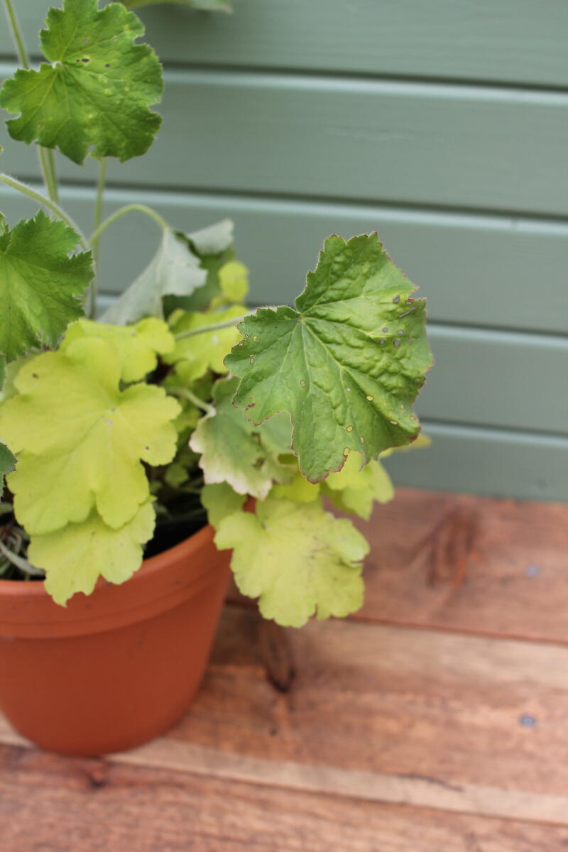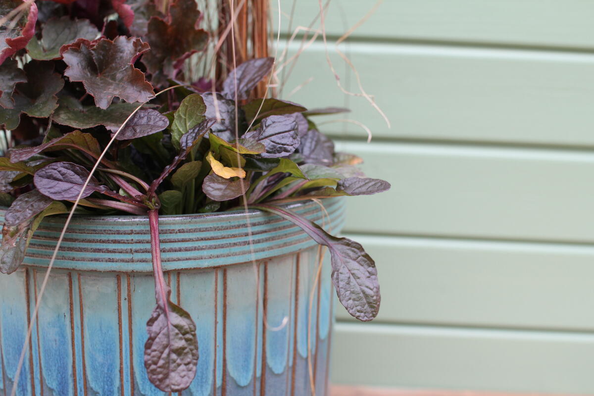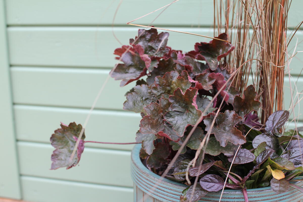 - Dlužicha ‘Rachel’ (Heuchera ‘Rachel’) vnese do nádoby sytě vínové listy s kovovým leskem. Její barva krásně kontrastuje s glazurou květináče a zároveň ladí s podzimní náladou.