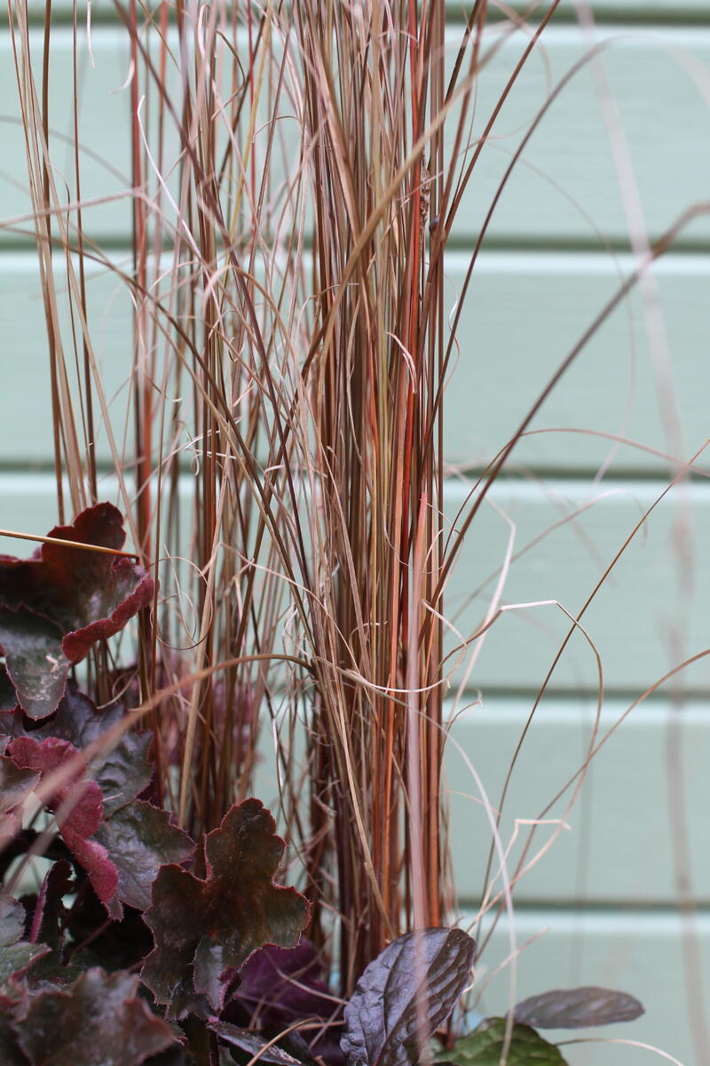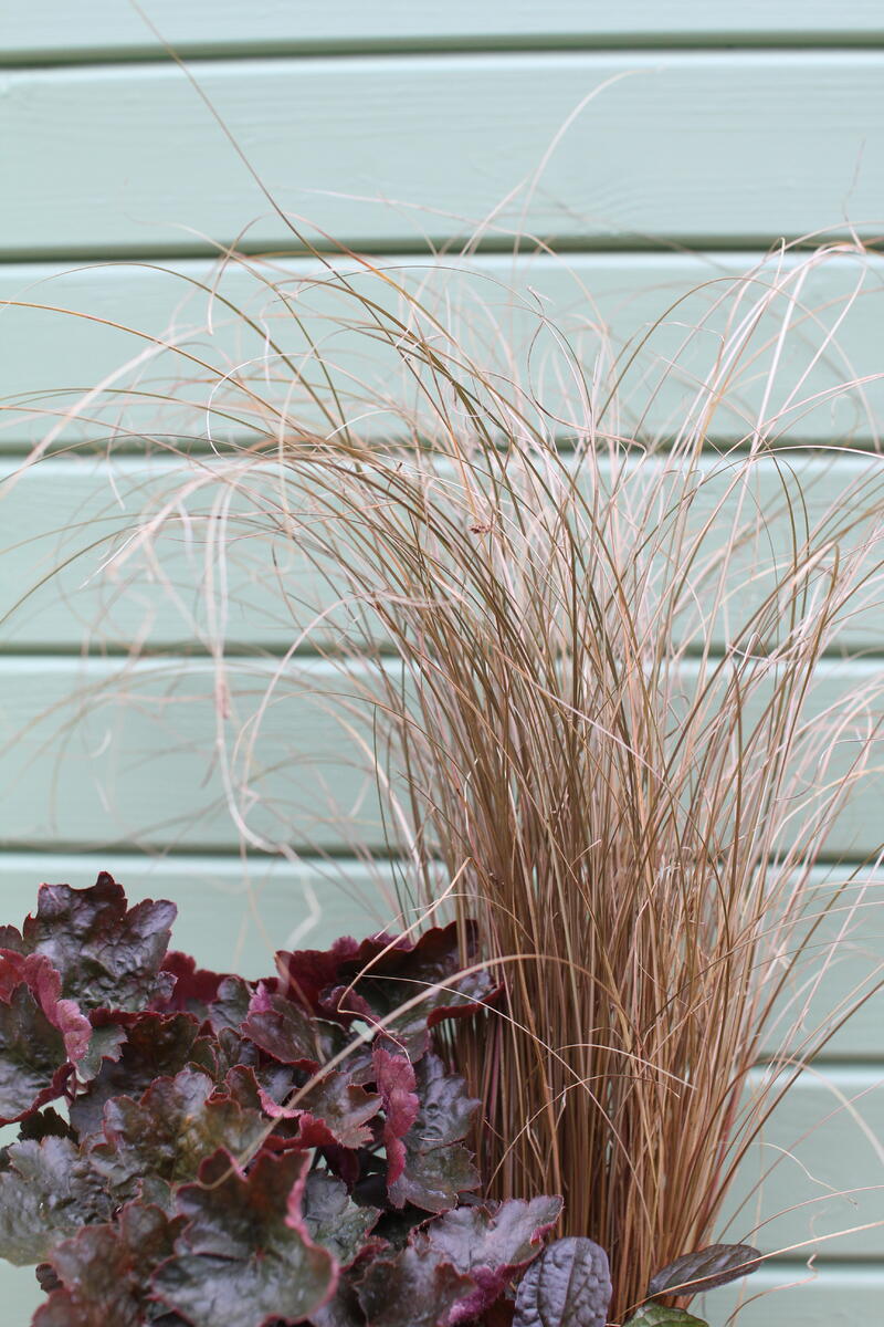 - Ostřice Buchanova (Carex buchananii) dodá celé výsadbě lehkost a pohyb. Její bronzově hnědé, jemné listy vytváří vzdušný kontrast k hutným listům dlužichy a zběhovce. Můžete ji nahradit podobně laděnou ostřicí ‘Red Rooster’ (Carex buchananii ‘Red Rooster’).