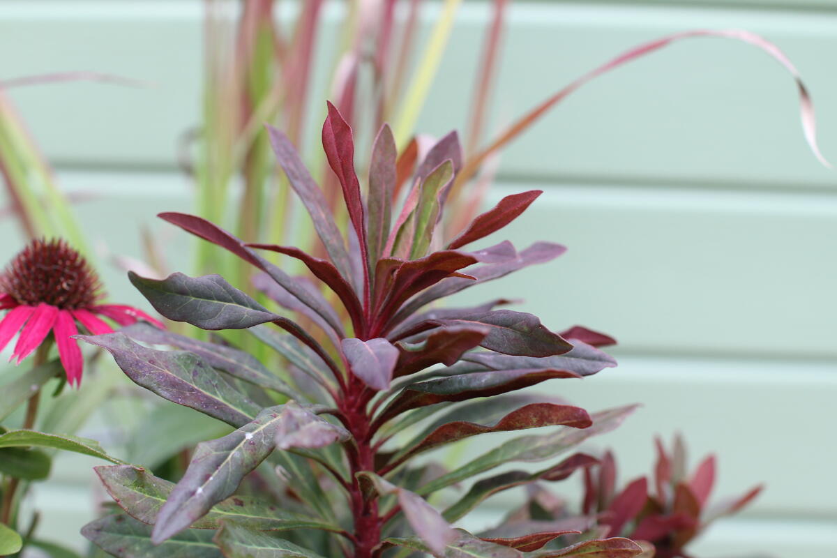 - Zběhovec 'Sugar Plum' vytváří hustý, koberec listů, který se hezky rozrůstá a doplňuje dlužichu. Působí jako vyplňující prvek a dodává aranžmá hloubku.