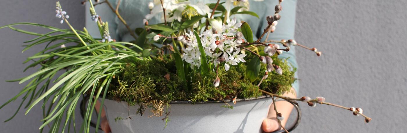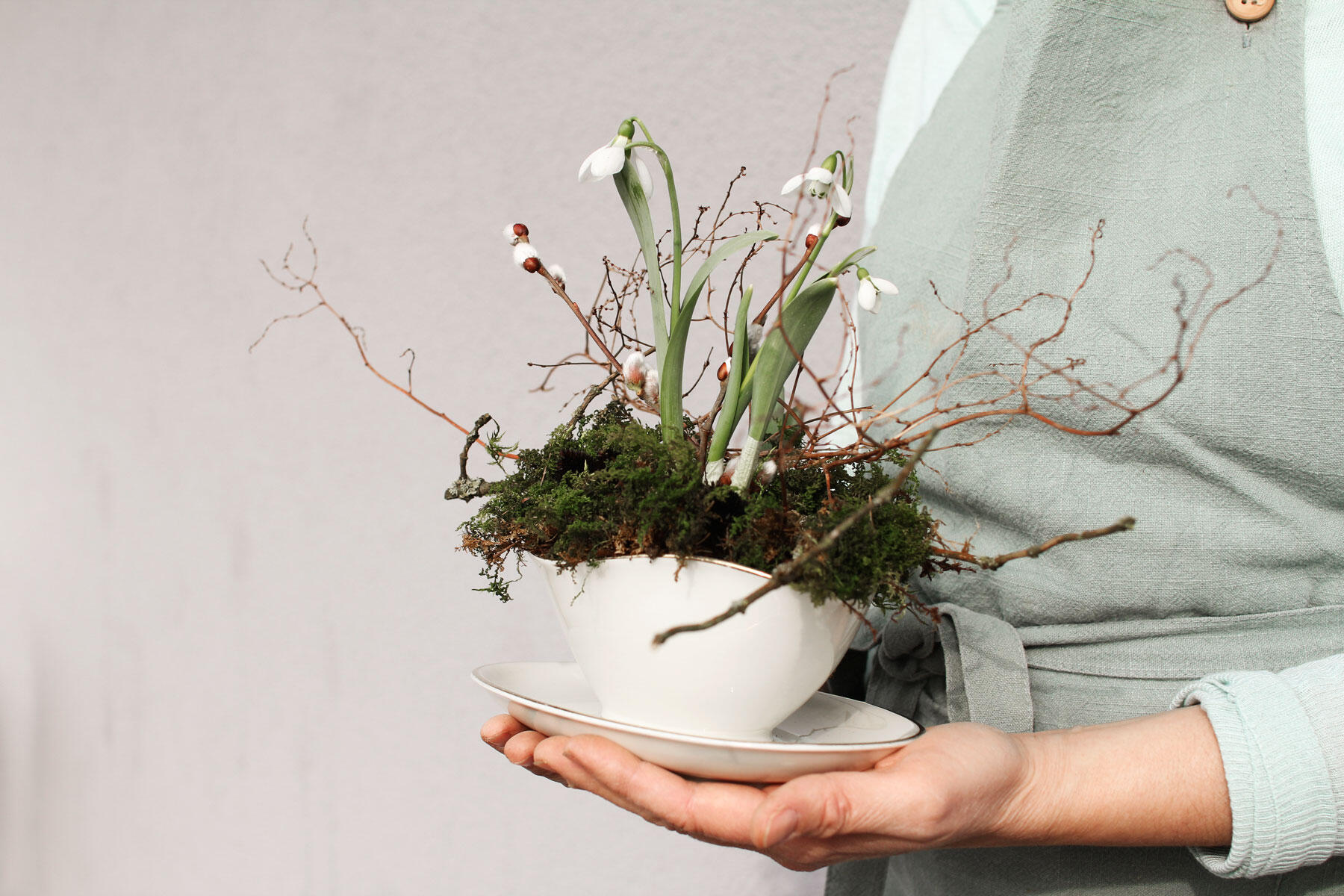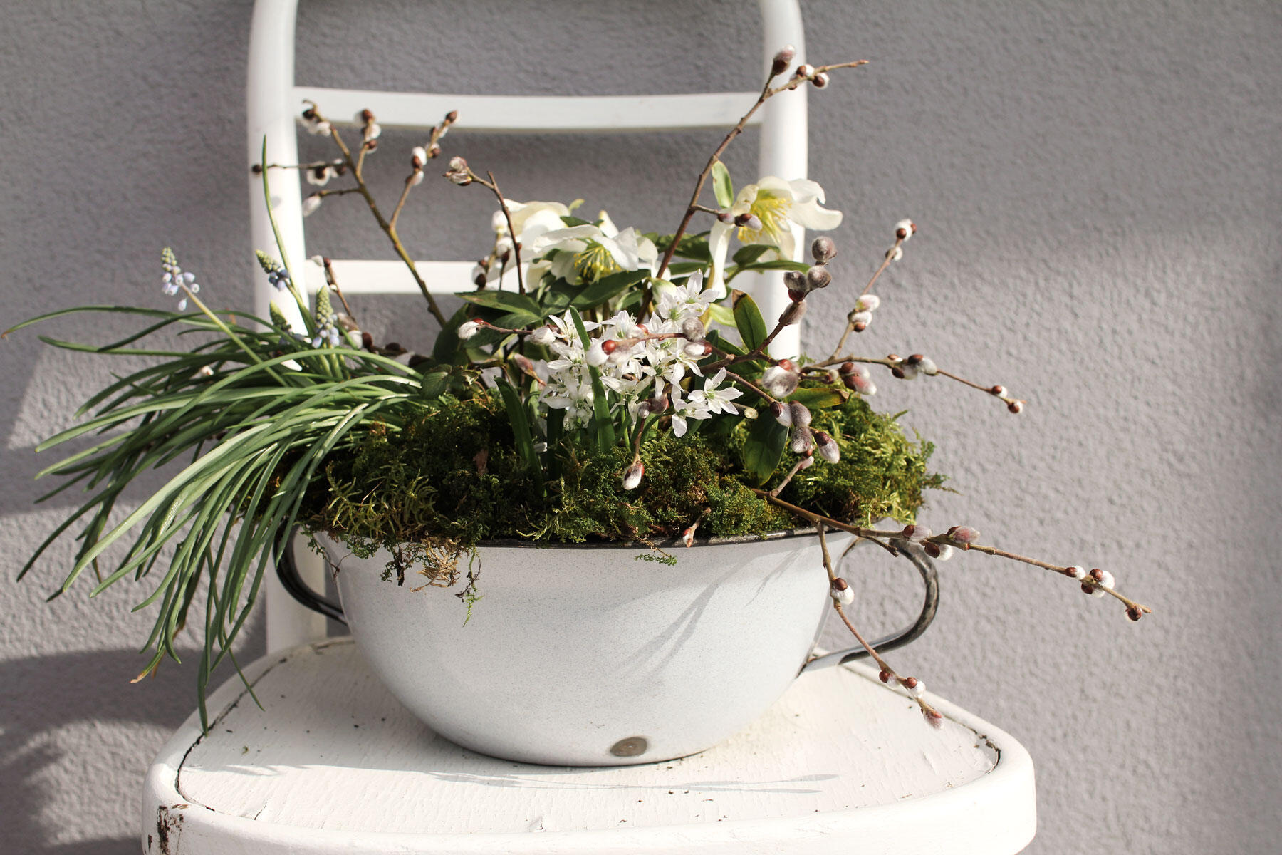 Staré nádobí se k aranžování používá s oblibou. Efektní a finančně nenáročná kombinace sněženky v omáčníku je neotřelá a romantická. Do mechu jsou zapíchnuté větvičky kočiček, popínavého rdesna a drobné větvičky porostlé mechem. Nic víc, nic míň.