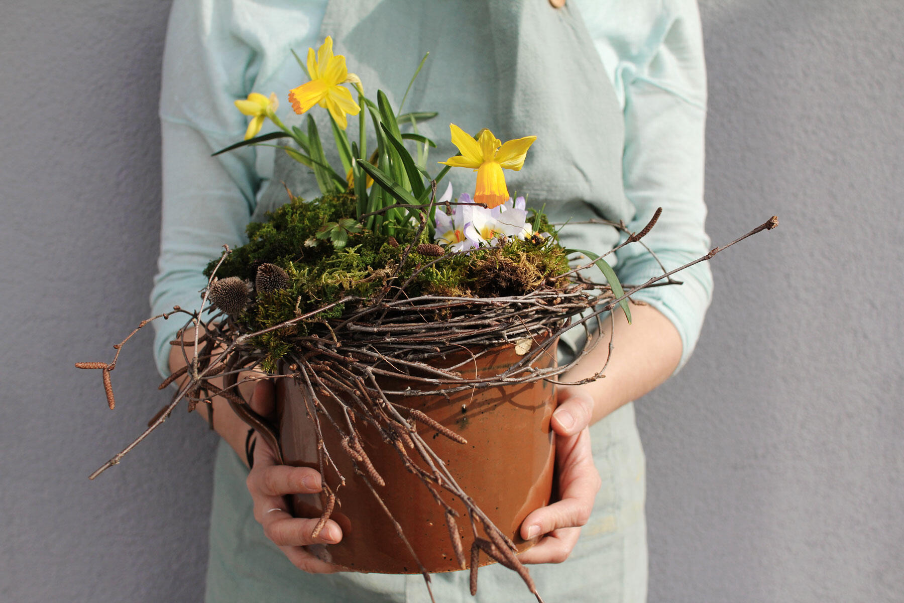 Stará hliněná nádoba přímo vybízí k využití tradičních cibulovin. Žlutý narcis a fialově modré krokusy jsou doplněné mechem a nedbalým věncem z větviček břízy.