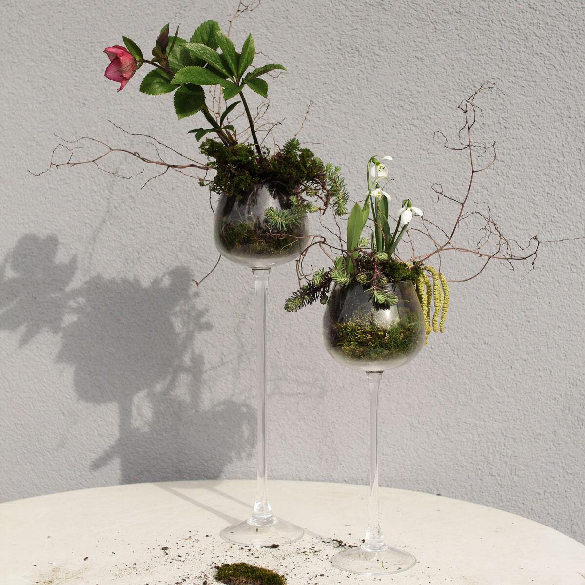 Rostliny můžete aranžovat i do neobvyklých nádob. Co třeba takové vysoké skleněné sklenice? Hezky se do jedné z nich vejde sněženka (rozdělily jsme trs z květináče, aby se vešel do sklenice). V druhé sklenici je čemeřice (tuto tmavou bohužel nemáme, ale úžasně vynikne tato růžová Helleborus orientalis 'Double Ellen Pink'. Přidejte mech, přes okraj nechte viset jehnědy a rozchodník Sedum forsterianum ssp. elegans 'Silver Stone'.