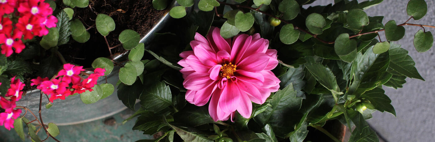 Kombinace fialové a bílé je neokoukaná, zářivě růžová ji prosvětlí. Barevné listy povíjnice působí tajemně. Tento truhlík se hodí na slunce i do polostínu.