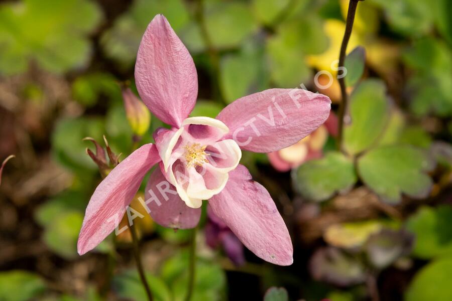 Aquilegia flabellata 'Cameo Rose White' je nízká trvalka dosahující výšky kolem 20 cm. Listy zelené barvy jsou dělené do úkrojků a vytváří bochánkovitý trs. Květy jsou růžovobílé se svěle žlutým až bílým středem.… Vše o produktu