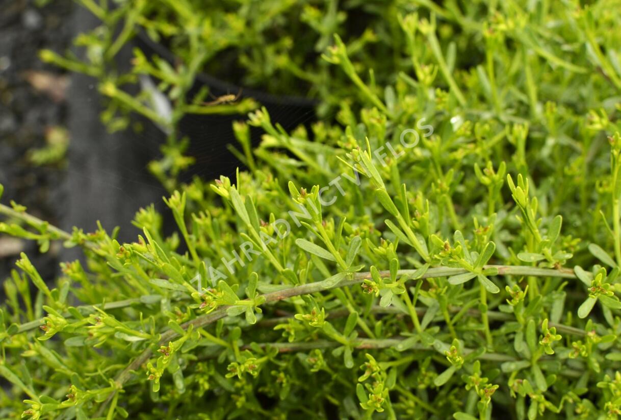 Nízký keř tvoří husté, převislé větvičky, které se rozlévají do stran a pokrývají půdu. Na jaře se větve obalí množstvím sytě žlutých květů, které vytvářejí výrazný barevný koberec. Drobná zelená olistění zvýrazňuje sytou barvu květů a působí svěže po celou sezonu.