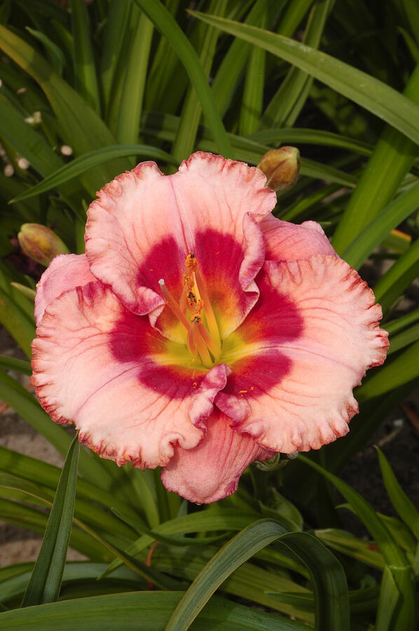 'Cherry Valentine' kvete růžovými květy s růžovo-červeným okem a výrazně zvlněným lemem. Opakuje kvetení. Dorůstá do výšky 60cm. V mírnějších zimách udržuje olistění.