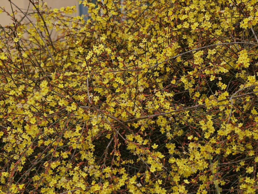 Tento opadavý, v podstatě metlovitě rostoucí keř se bez opory neobejde. Pokud není vyvázán k opoře, roste poléhavě. Kvete ještě před olistěním žlutými květy. Doba květu je přibližně od prosince do března. Větvičky má hranaté, zelené a na nich vstřícné trojčetné listy. Mívá problémy s namrzáním, takže je vhodné mu poskytnout zimní ochranu minimálně kořenů a vysazovat ho do chráněnějších poloh. Po namrznutí velmi dobře obráží.