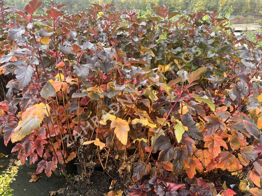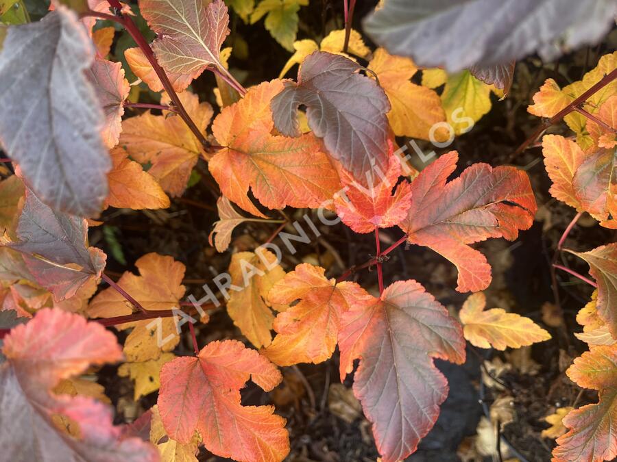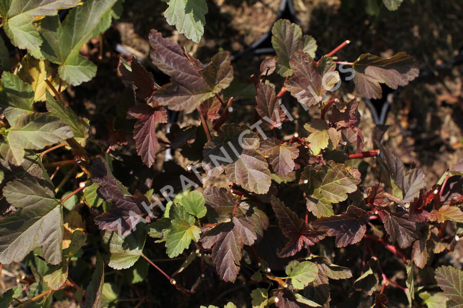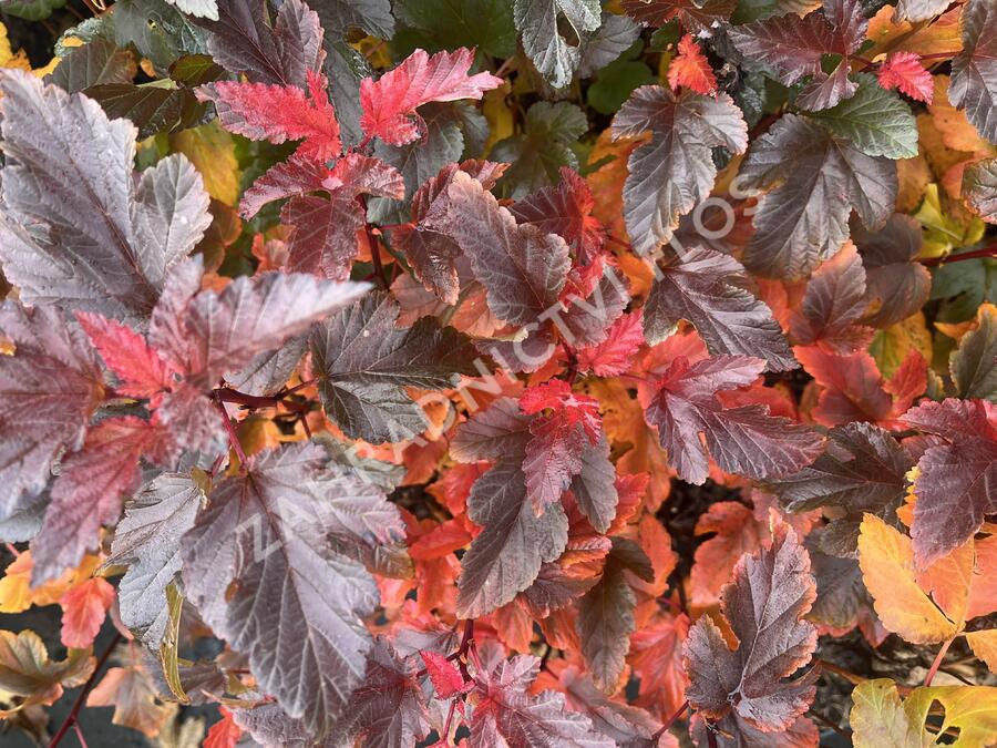 Na jaře raší v teplých červenooranžových tónech, během léta přecházejí do sytě vínové až purpurové barvy a na podzim se zvýrazní ohnivé odstíny červené. V červnu až červenci keř rozkvétá kulovitými chocholíky drobných bílých květů, které vyniknou na tmavém listoví. Po odkvětu se tvoří drobná červená plodenství, jež zdobí rostlinu až do podzimu.