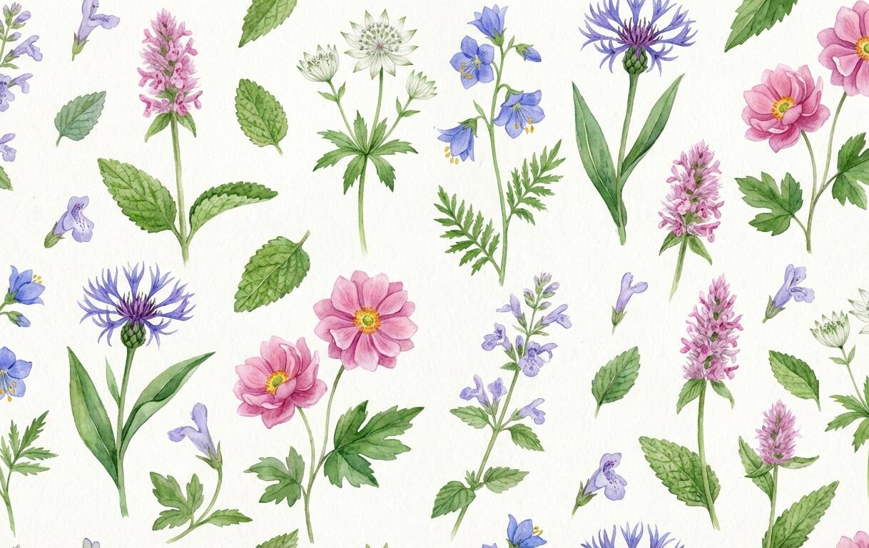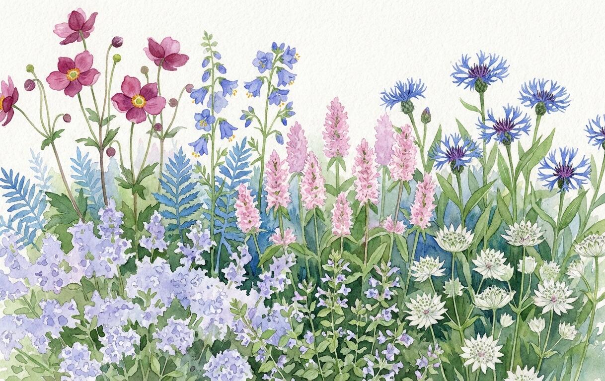 - Trvalky kvetou v odstínech růžové, bílé a fialové.