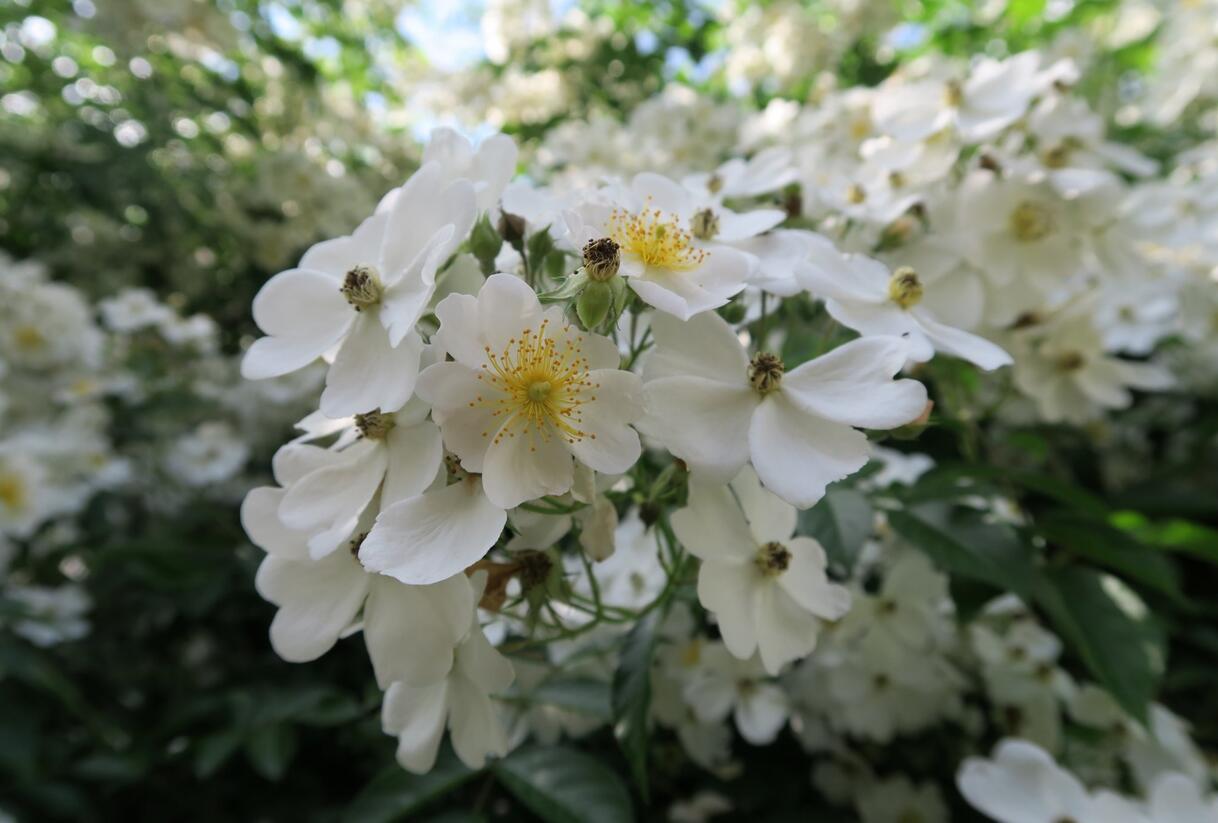 Bohatě kvetoucí popínavý keř s množstvím drobných, čistě bílých květů, které se objevují ve velkých soukvětích a doslova obalí celý keř. Leskle zelené listy vytvářejí svěží pozadí a na podzim krásně vyniknou s malými, sytě červenými šípky.
