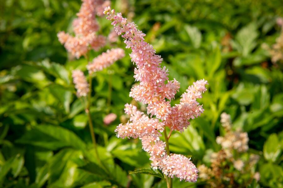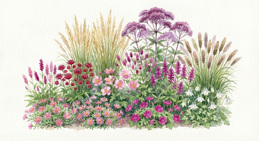 Trvalkový záhon můžete vysadit do polostínu nebo na slunce s částečně zastíněným okrajem. Romantická kombinace trvalek kvetoucí v tónech růžové je doplněna travinami.