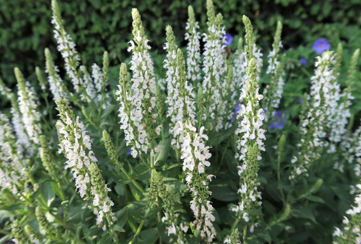Salvia superba je kříženec několika druhů. Kultivar 'Merleau White' dorůstá do výšky okolo 30 cm