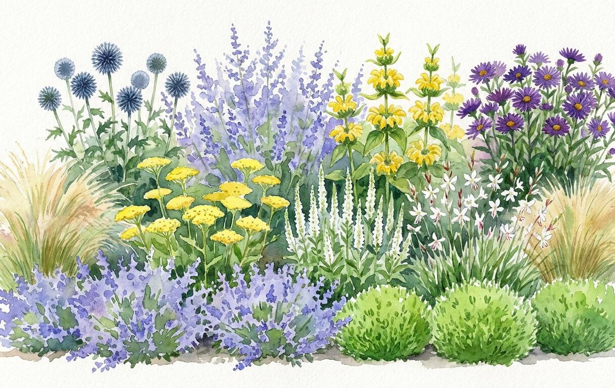 Slunečná obloha v létě, to je bledě modrá a žlutá, s bílými odlesky. Záhon se hodí do venkovské i moderní zahrady. Kombinace polokeře, trvalek a okrasné trávy je zajímavá od jara až do podzimu. Trávy přes zimu nesvazujte, abyste si užili jejich zimní efekt.