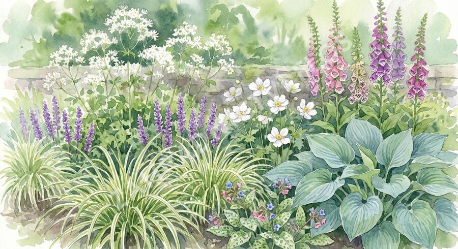 Neobvyklá kombinace osvědčených trvalek, díky které bude stinné místo v zahradě prosvětléné. Květy v jemných barvách od bílé, přes růžovou po fialovou budou příjemným kontrastem v tmavém zákoutí. Vybrané rostliny jsou okrasné i svými zajímavými listy. Struktura záhonu je harmonická od jara do podzimu.
