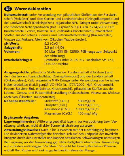 Po 2 až 3 týdnech začněte s přihnojováním pěstovaných rostlin. Deklarovaný obsah živin v substrátu se vztahuje k době uvedení na trh výrobcem a může podléhat přirozeným výkyvům.