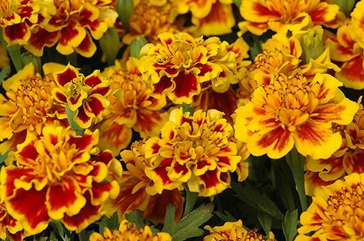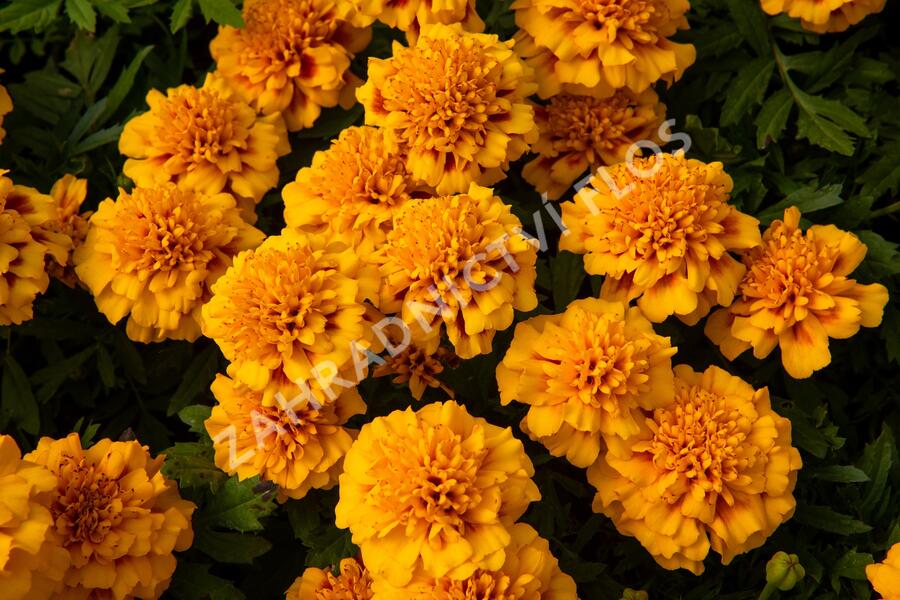 Tagetes patula 'Texana Yellow Fire' bohatě nakvétá během celého léta množstvím plných žlutých květů s červenohnědou kresbou. Rostliny tvoří nižší kompaktní keříčky s jemnými tmavě zelenými lístky, které pod záplavou… Vše o produktu