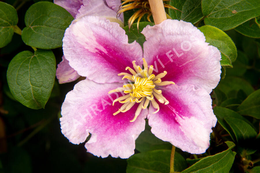 Barva květu je růžová přičemž uprostřed okvětního lístku je tmavší růžový pruh a směrem k okrajům růžová barva světlá. Tyčinky mají výraznou žlutou barvu. Po odkvětu se vytvoří ochmýřené nažky, které vypadají velmi dekorativně. Rostlina kvete velkým množstvím květů, které mnohdy překrývají její listoví. Tato dřevitá liána má listové úponky, kterými se přidržuje opory, po které se pne. Listy jsou sytě zelené, trojdílné a na zimu opadávají.